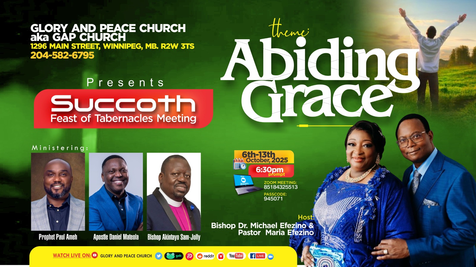 We warmly welcome you to Glory & Peace Church International – a ministry for all people, of all nations! We earnestly believe that miracles happen when someone cares. And we care about you! Join us on Sundays at 10 a.m. and 7 p.m., Wednesdays at 7 p.m., and Fridays at 7 p.m. You can also watch previous sermons online. Come, let us worship together!